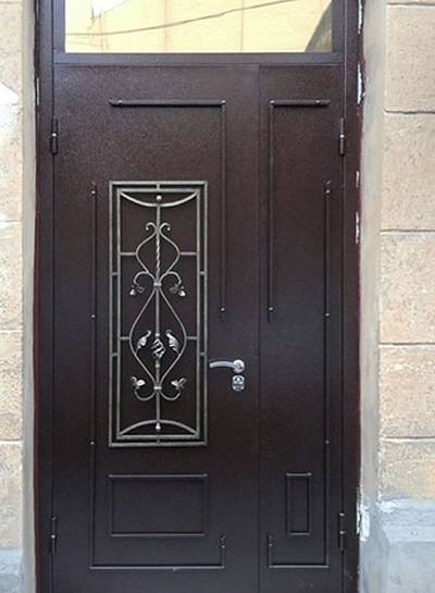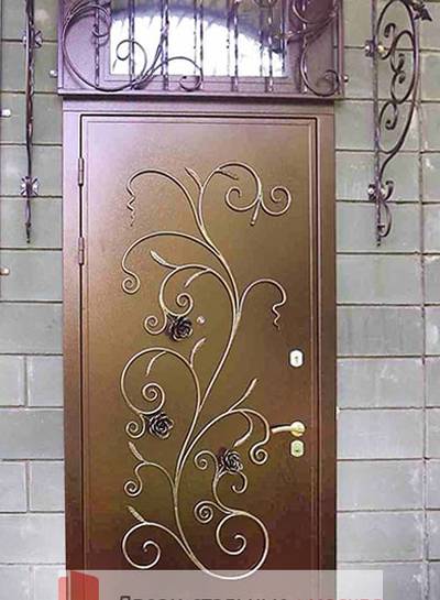 Стальные двери с ковкой состоят из двух основных частей: стальной коробки из профиля 50х25 мм, полотна из сертифицированного металла толщиной 2,2 мм (российского производства). Полотно дополнено продольными ребрами для повышения жесткости и притворной полосой.